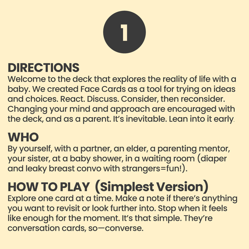 Unlike traditional birth prep, FACE Cards: Pregnancy & Birth Edition are about you—what helps you feel safe and supported, and what your body and your relationship need to have your best possible experience. Each card is curated to spark curiosity, conversation, and connection.