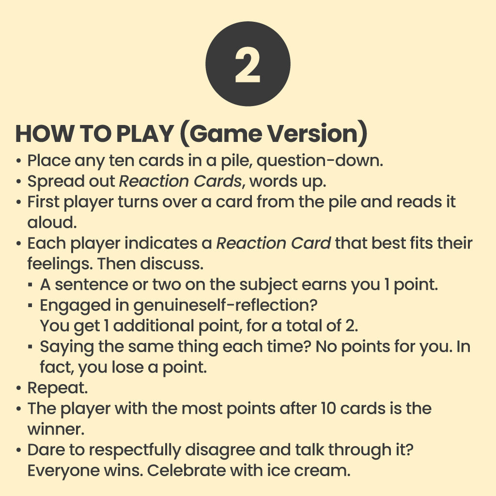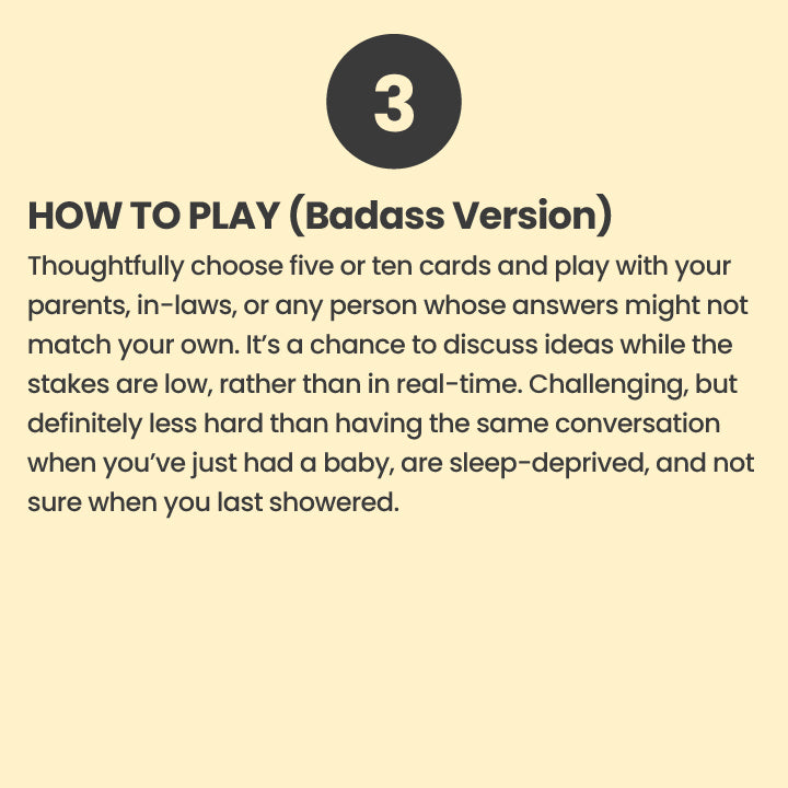 Badass version: Same as Option 2, but this time as a communication tool with someone who might answer differently from you. It isn’t you bringing it up — it’s the cards.