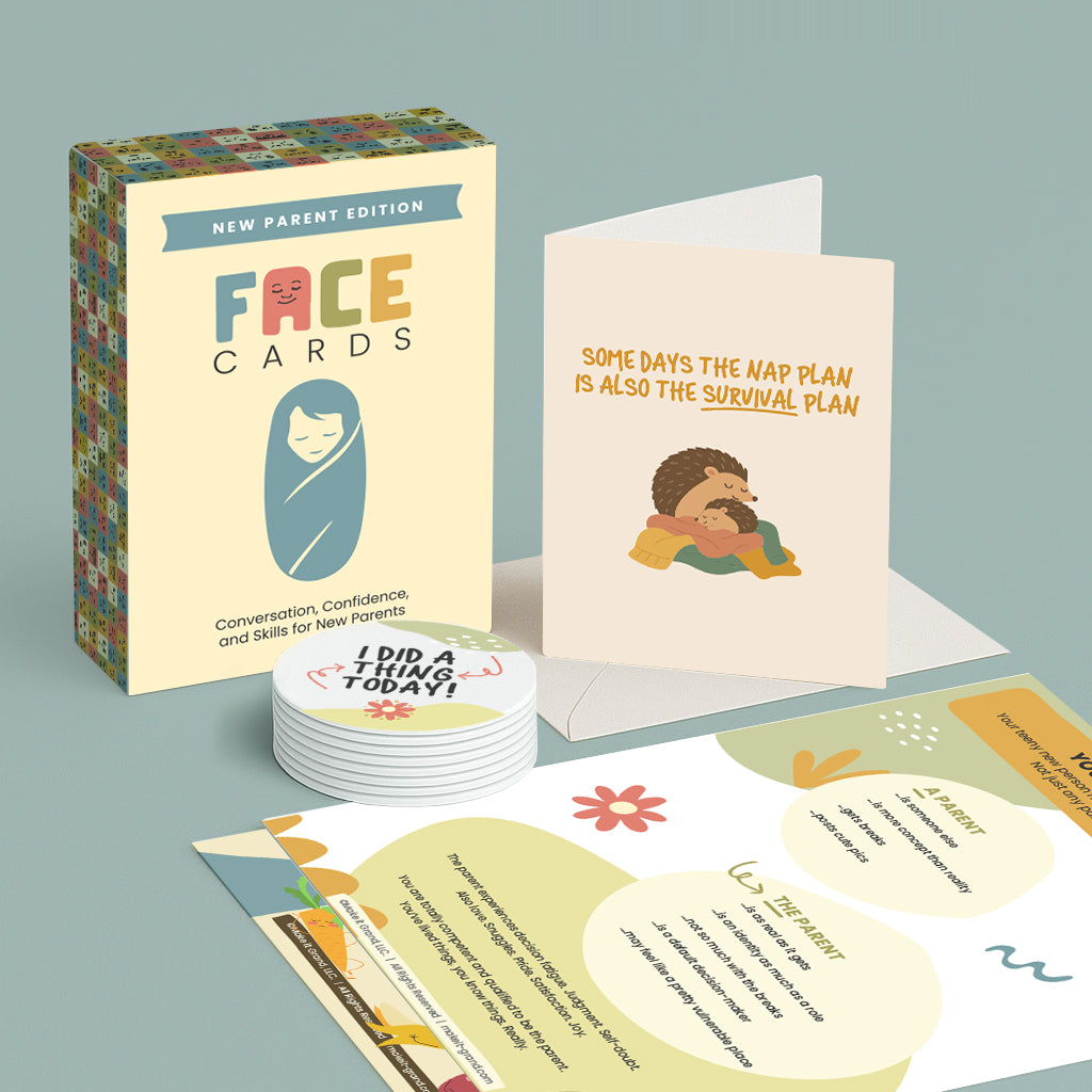 FACE Cards – New Parent Edition: Real-talk conversation prompts offering crowd-sourced survival tips. Combined with thoughtful prompts to help you identify your priorities and style as a parent, this is your move for easing into parenthood.